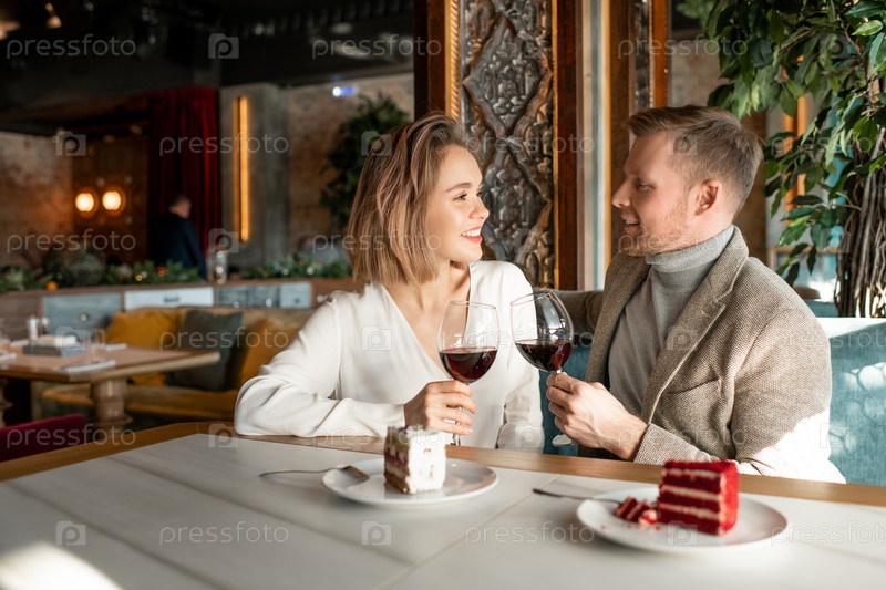 Молодая романтическая пара со стаканами красного вина разговаривает и делает тосты
