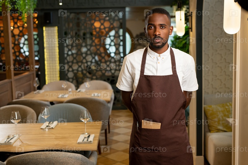 Молодой официант африканской этнической принадлежности в униформе стоит на переулке между столами