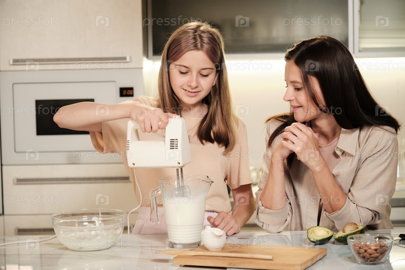 Счастливая блондинка-подросток держит электрический микшер в большом кувшине со свежим молоком