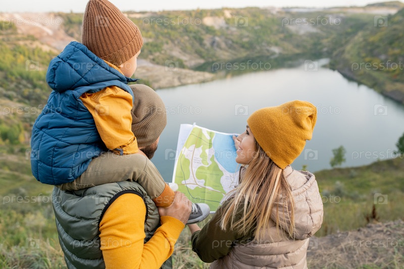 Молодая блондинка-улыбающаяся женщина с картой смотрит на мужа со своим маленьким сыном на шее