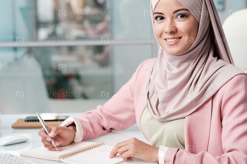 Улыбающаяся молодая мусульманка в хиджабе и умной повседневной одежде делает заметки