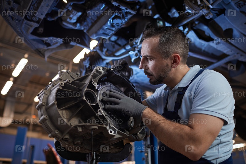 Автомеханик исправляет автомобиль на лифте