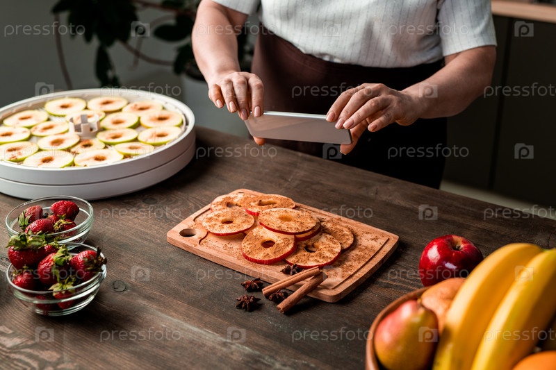 Руки зрелой самки, держащей доску для нарезания с грудой свежих кусочков яблок