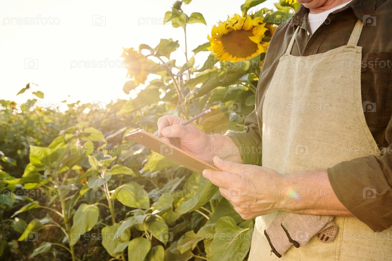 Руки старшего фермера-мужчины в фартуке и рубашке, делающие заметки в документе