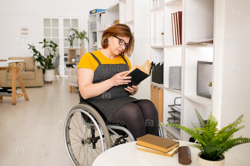 Молодая женщина-инвалид в повседневной одежде и очках читает книгу на инвалидной коляске