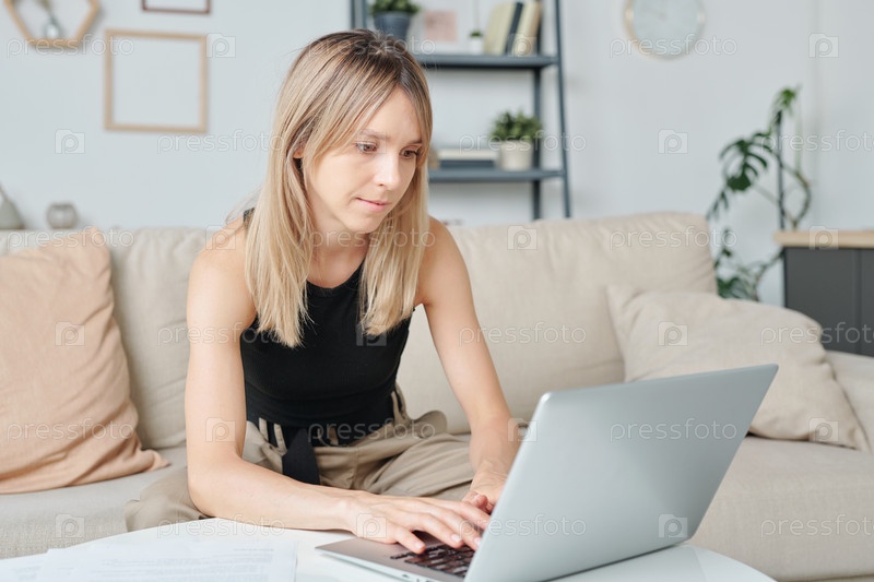 Молодая красивая женщина с длинными светлыми волосами смотрит на данные на дисплее ноутбука