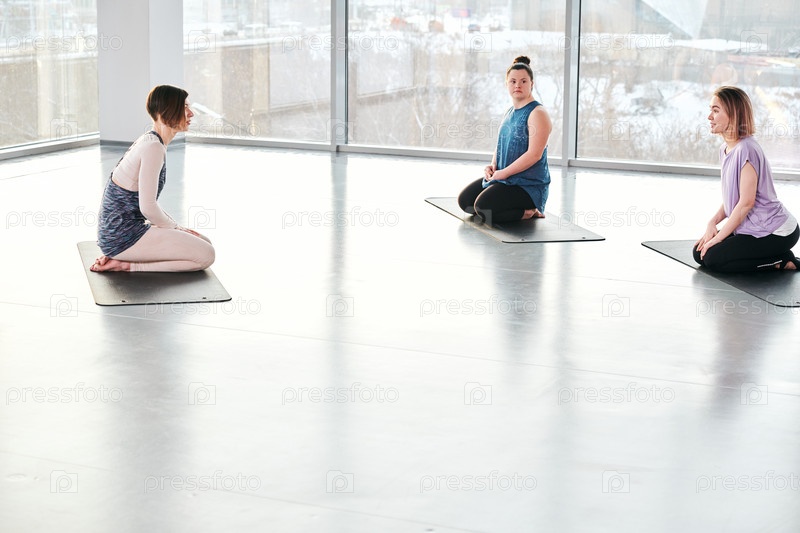 Две молодые женщины в спортивной одежде сидят на ковриках перед своим тренером в тренажерном зале