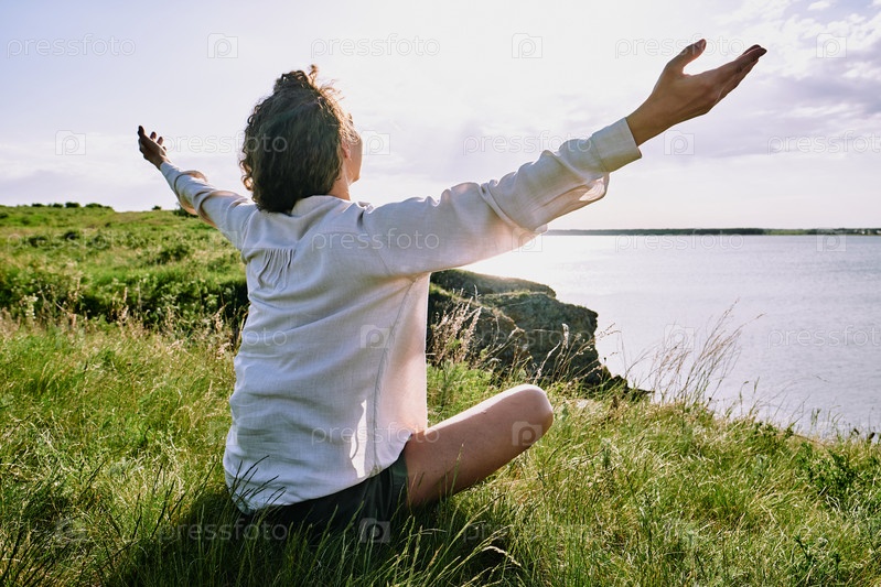 Счастливая молодая расслабленная женщина с распростертыми руками, сидящая на земле у озера