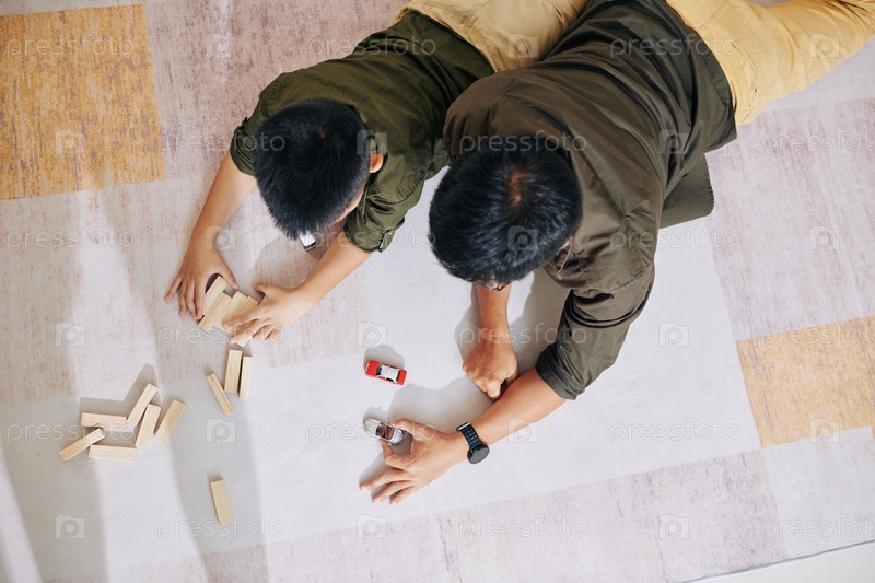 Отец и сын играют с игрушками