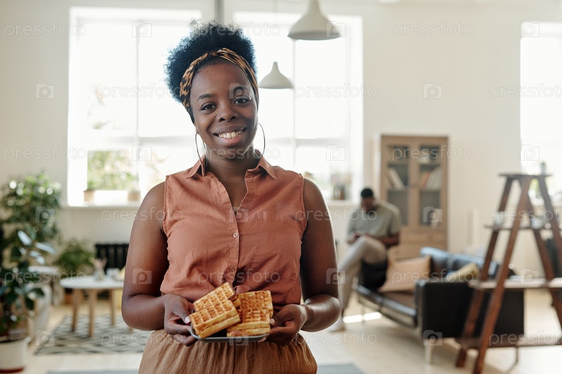 Молодая счастливая африканская женщина с домашними вафлями, стоящая против своего мужа