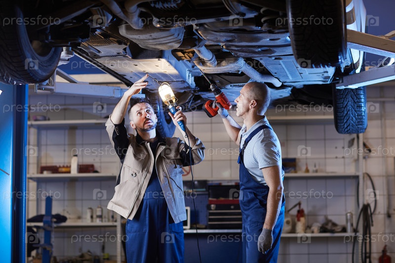 Автомеханики проверяют автомобиль на лифте