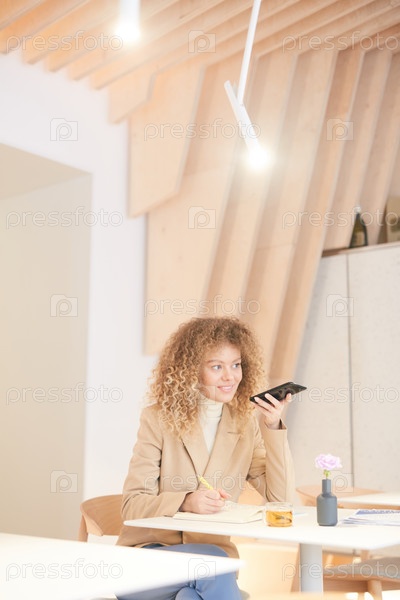 Молодая женщина диктует голосовое сообщение в кафе