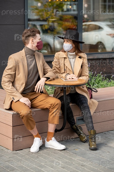 Молодая спокойная пара в защитных масках и повседневной одежде отдыхает на свежем воздухе