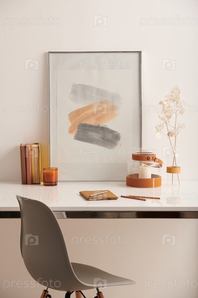 Вертикальный безлюдный снимок современного минималистического интерьера рабочего пространства со столом и стулом на белом фоне стены, копировальное пространство