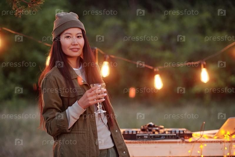 Счастливая азиатская девушка с длинными волосами, держащая напиток в руках и стоявшая на огне