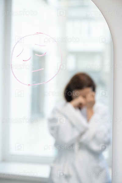 Расстроенное лицо, нарисованное помадой на зеркале и отражение несчастной молодой женщины