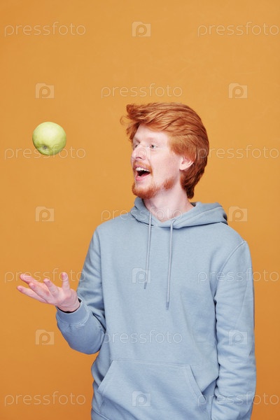 Счастливый молодой случайный мужчина бросает зеленое яблоко перед собой, развлекаясь