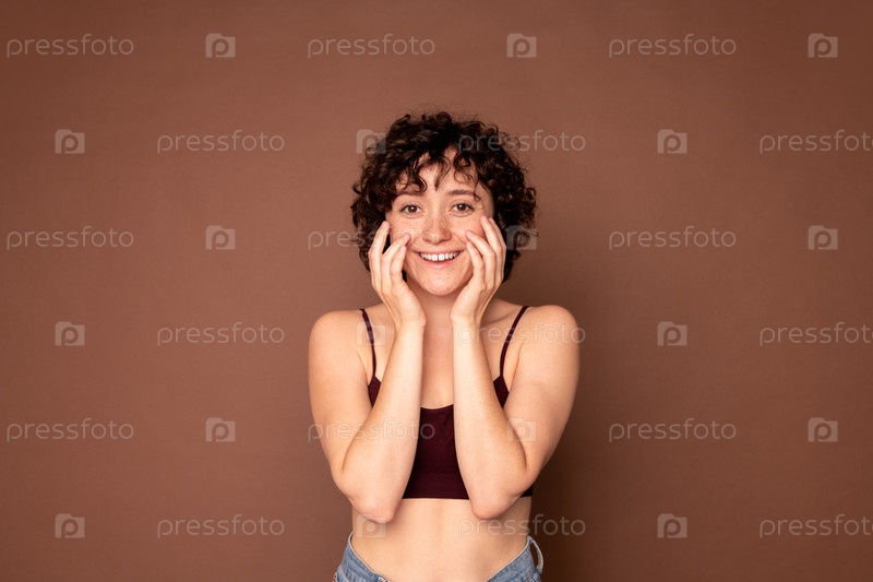 Счастливая красивая молодая женщина с короткими темными кудрявыми волосами, держа руки за лицо