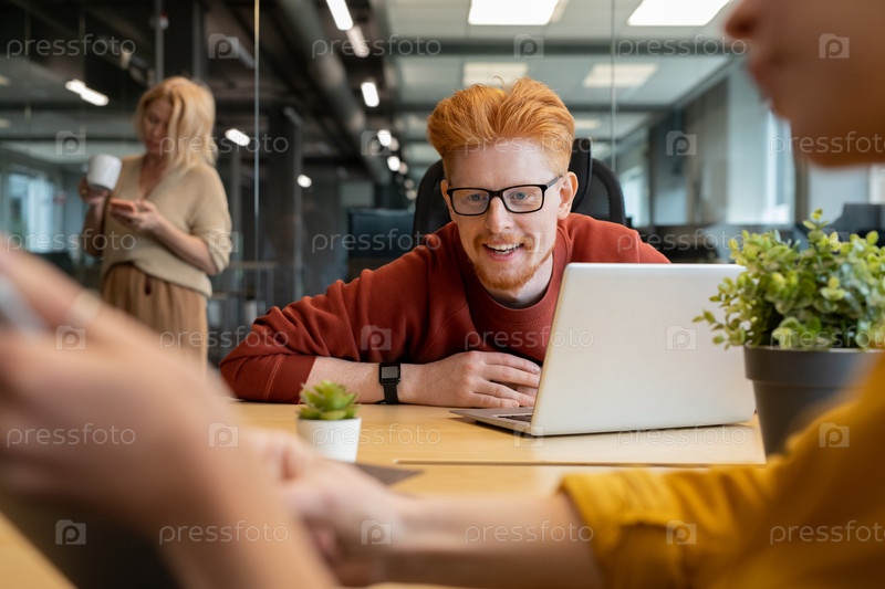Молодой бизнесмен в повседневной одежде смотрит на экран планшета, который держит коллега