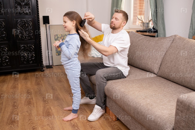 Молодой человек в повседневной одежде сидит на диване и чистит длинные волосы своей дочери