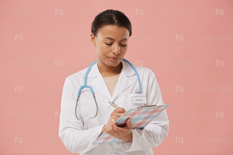 Женщина-врач, позирующая на молодой розовой