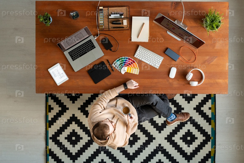 Расслабленный дизайнер, пьющий кофе