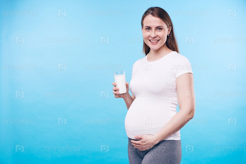 Счастливая молодая женщина со стаканом молока, касающимся ее беременного живота