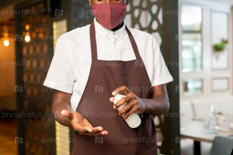 Молодой официант в униформе и защитной маске распыляет святитель на руки
