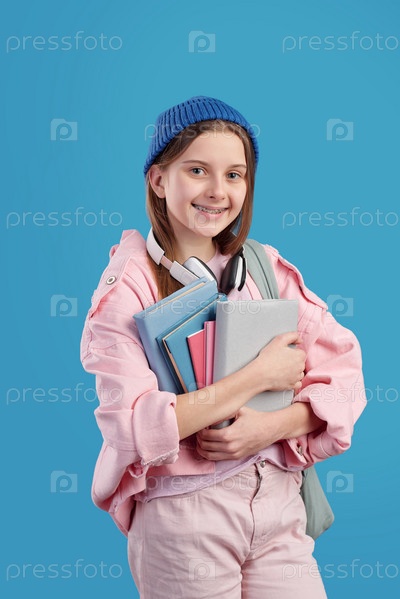 Довольно умная девочка-подросток с книгами на груди, стоящая перед камерой