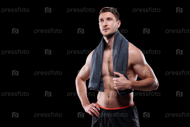 Активный молодой мускулистый мужчина без рубашки с полотенцем на шее, держа одну руку за талией