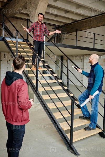 Счастливый молодой бригадир в повседневной одежде разговаривает со своей командой на лестнице