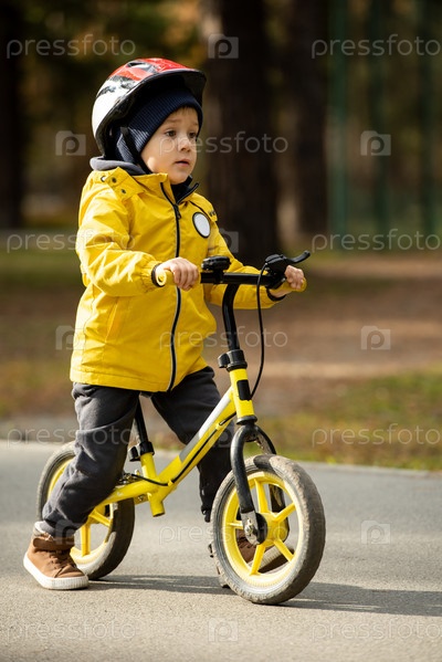 Милый мальчик в защитном шлеме ездит на велосипеде с балансом по асфальтной дороге
