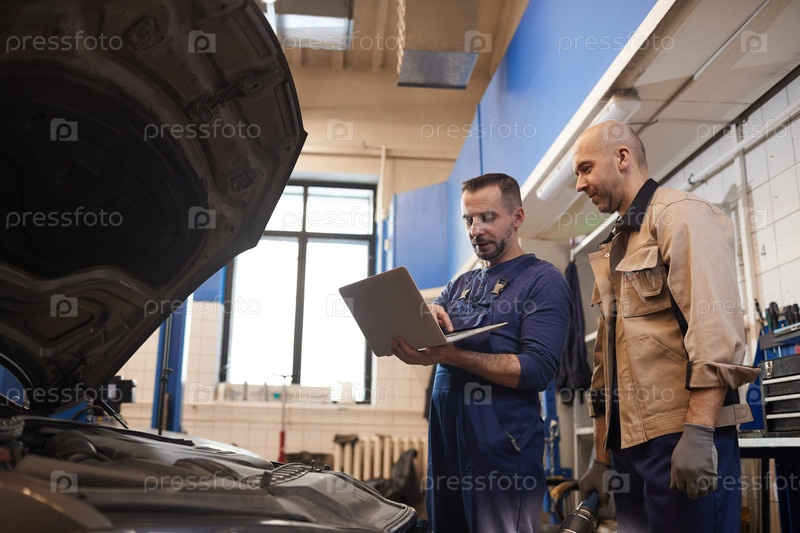 Два работника проверяют автомобиль в автомагазине