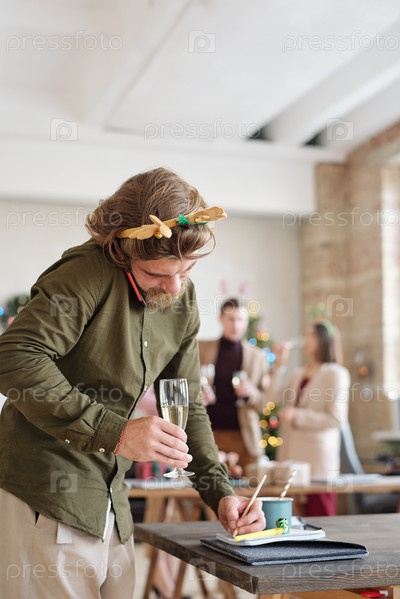 Загруженный молодой бородатый мужчина с флейтой шампанского, разговаривающий по мобильному телефону