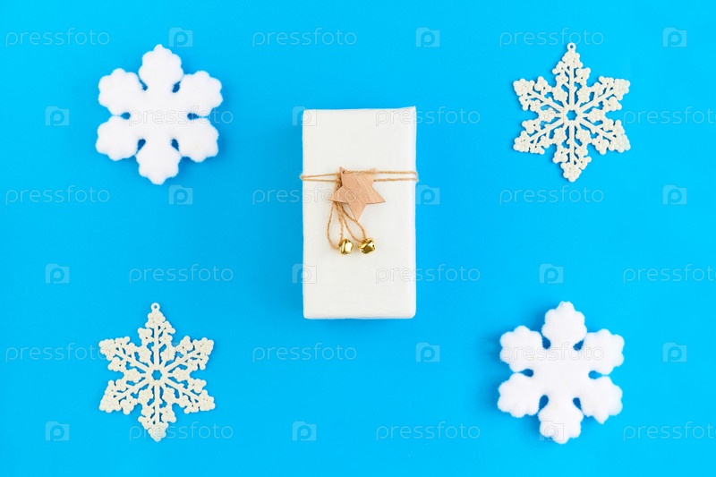 Плоский макет белого пакета с рождественским подарком со звездой и нитью вверху