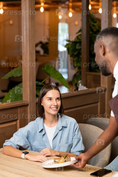 Молодая улыбающаяся женщина в синей рубашке смотрит на африканского официанта, обслуживающего ее