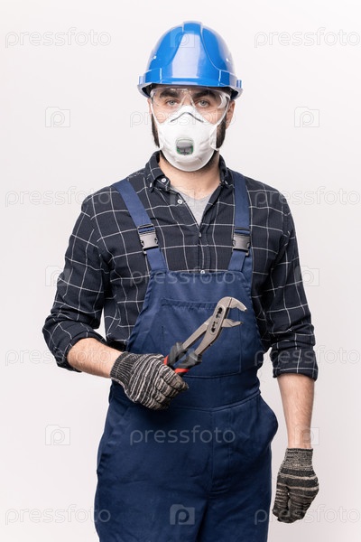 Молодой сантехник или мастер-ремонтник в рабочей одежде, шляпе, перчатках и защитной маске