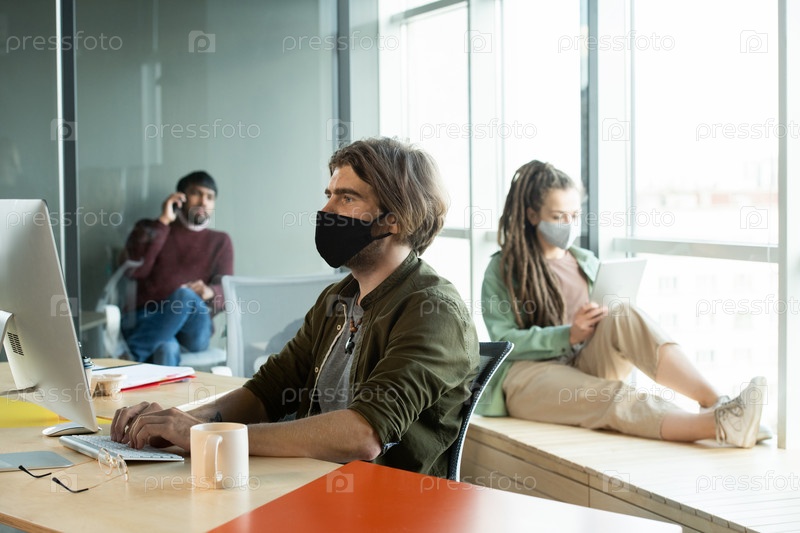 Молодой бизнесмен в черной защитной маске и повседневной одежде, использующий компьютер