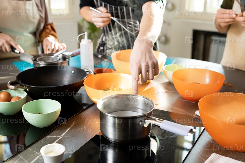 Рука молодого тренера по кулинарии, указывающего на сковородку с теплой водой на электрической плите