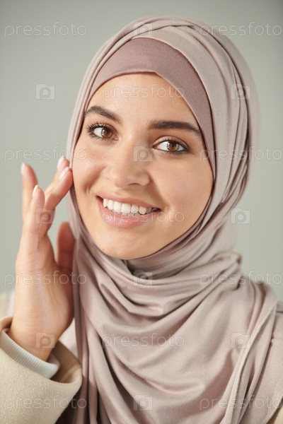 Вертикальный крупный снимок головы и плеч красивой молодой женщины в бледно-розовом головном уборе, улыбающейся на камеру