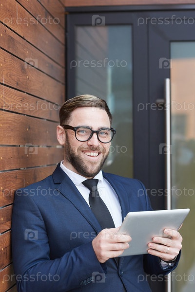 Бизнесмен, использующий планшетный компьютер на открытом воздухе