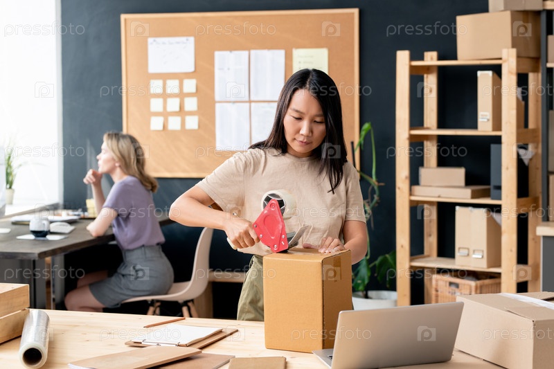 Молодая азиатская женщина, работающая в онлайн-магазине или складе для упаковки заказов