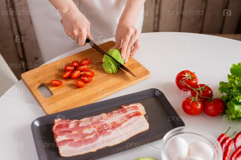 Руки молодой домохозяйки, режущей свежие авокадо и помидоры на доске для выреза