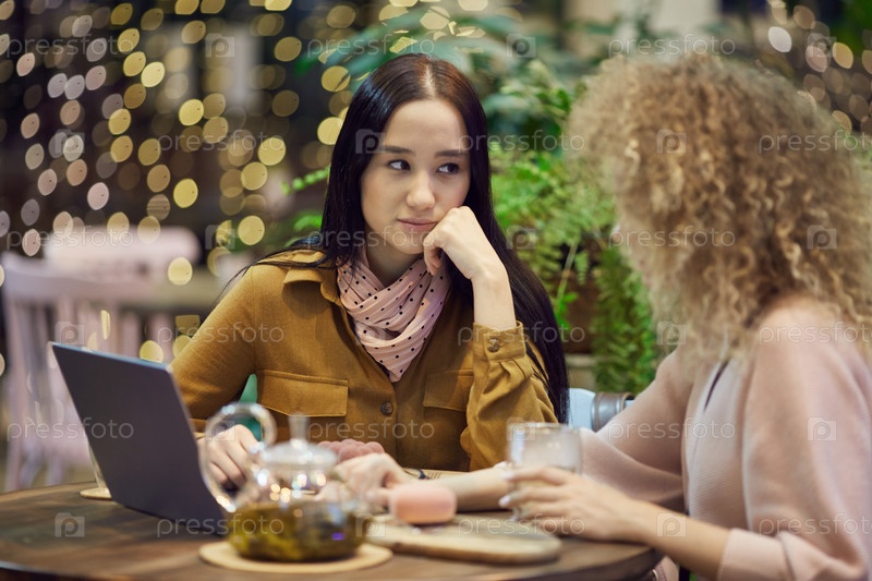 Женщина сидит в кафе с коллегой
