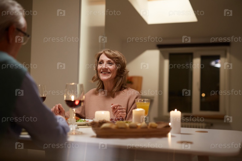 Счастливая женщина ужинает со своим мужем