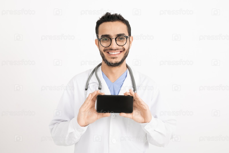 Веселый молодой врач с зубчатой улыбкой фотографирует вас на смартфоне