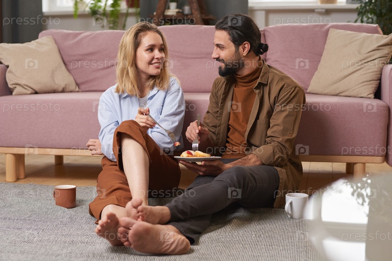 Красивый молодой человек и привлекательная женщина проводят утро вместе, сидя на полу в гостиной за завтраком
