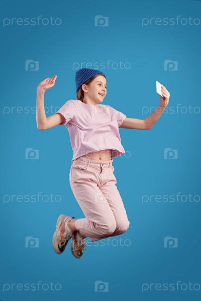 Экстатическая девочка-подросток в повседневной одежде, держащая смартфон перед собой