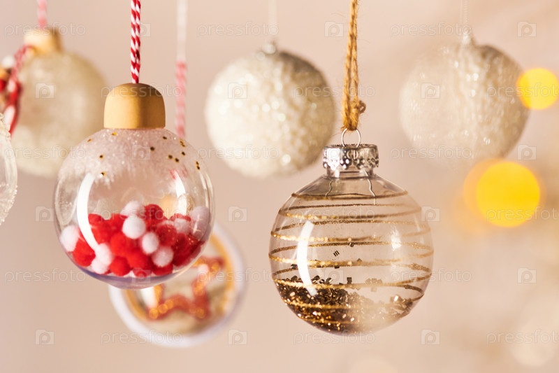 Прозрачные и белые блестящие декоративные шары висят перед камерой