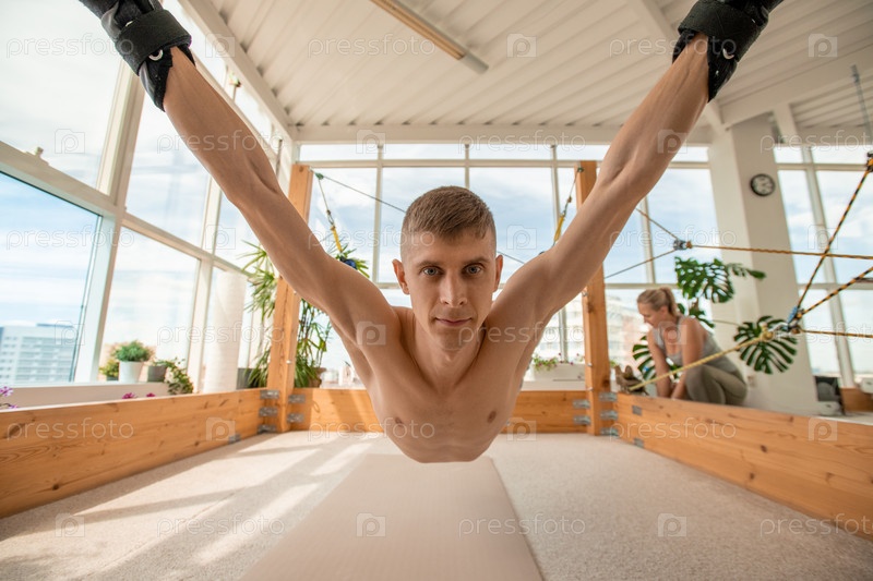 Спортсмен висит на полу с руками и ногами, закрепленными специальным оборудованием